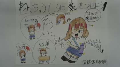 熱中症に気を付けよう。 公開日 2025/07/14 更新日 2025/07/14 児童生徒会活動の様子 熱中症予防のポスターを委員会の子たちが作成し、掲示しています。 自分たちからも発信し意識を高めましょう。