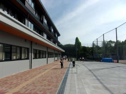 夏の朝空のもと、子どもたちは元気よく登校しています。