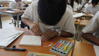 彫刻刀を使ってレリーフ作製をしています。