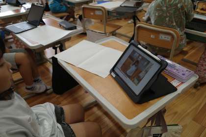 1年生も、iPadを活用して学習しています。3組さんでは、友だちにとってもらった写真を使って絵をかく学習をしていました。どの子も、指示通りに扱うことができています。