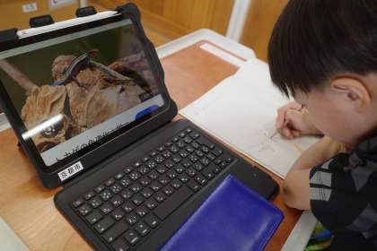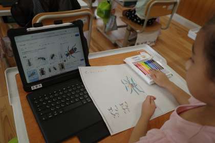 1年生も、iPadを活用して学習しています。2組さんでは、検索して見つけたイラストや写真をもとに、絵をかく学習をしていました。猫やトカゲ、ハンミョウなど、自分の興味に合わせて選ぶことができていました。