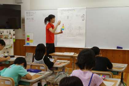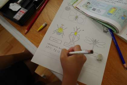 昆虫の体のつくりについて学習しています。「あたま・むね・はら」について、話し合いをしながら色分けしていました。足はどこから生えているのかについても、自分たちで気づくことができていました。