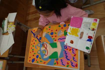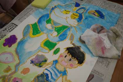 3年3組は、図工の学習で「お話の絵」に取り組んでいました。猫が主役のお話なのでしょうか、様々な猫が描かれていました。大きく、力強く、みんなが楽しんで描いている様子が伝わってくるようでした。