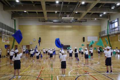 体育館では、4年生がフラッグを使った表現運動を行っていました。旗を振るのは、今日が初めてのようでした。勢いよく振ると、「ブワッ」と音がします。みんなで心を合わせて振れるように、これから練習を続けていきます。