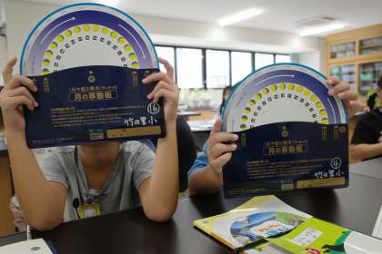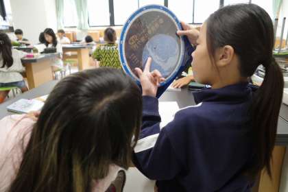 理科室で星座の学習をしています。星座早見表を使って、ある日の星の位置を確認していました。