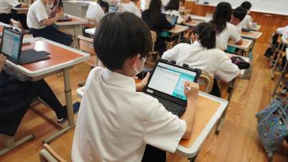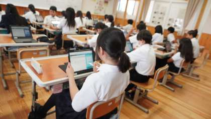 5年生はタブレット端末を使ってミライシードに取り組んでいました。