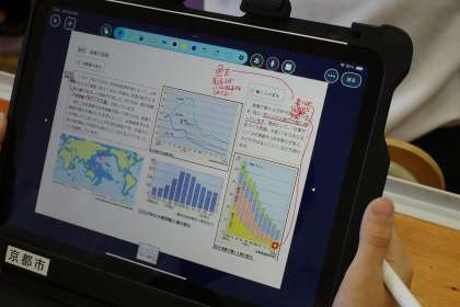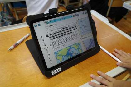 社会科の学習の様子です。教科書の代わりに、タブレットを開き、そこに気づいたことを記入し、意見を交流しています。