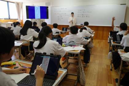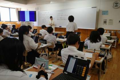 算数の学習「データの整理と活用」の単元では、自分の考えを整理するのにタブレットを使っていました。ペンでメモを書き込むことができるので、ノートのように使用している児童がたくさんいました。
