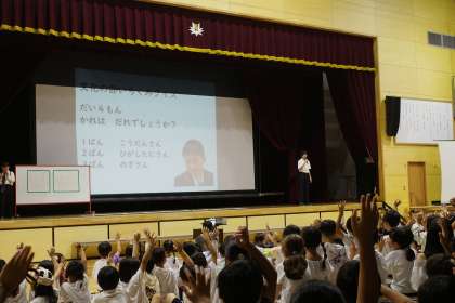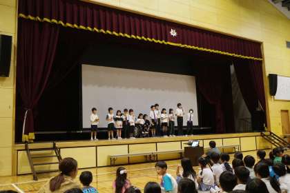 陵明祭_文化の部。前期1組さんは、クイズの発表です。会場も巻き込んで、楽しい発表をしてくれました。最後は、これまで何度も練習をしてきた「きらきらぼし」の演奏です。一人ひとりの役割を見事に果たすことができていました。