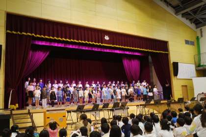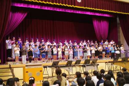 4年生は音楽の発表です。リコーダーでは「陽気な船長」という曲を音の重なりを意識して表現しました。きれいな音色を響かせていました。