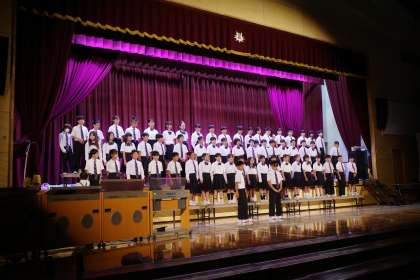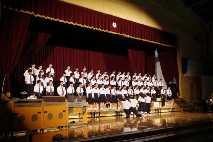 陵明祭_文化の部6 公開日 2025/10/17 更新日 2025/10/17 学校の様子 会場の児童生徒も入替わり、2ndステージの発表が始まりました。トップバッターは、5年生。音楽番組が進んでいくような構成で、合唱やハンドクラップを披露しました。