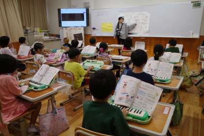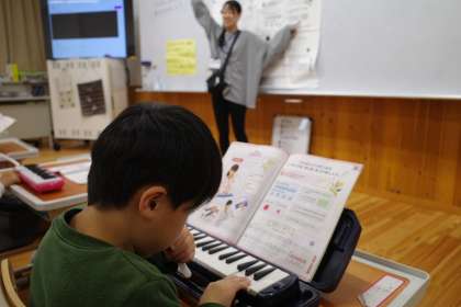 1年3組も音楽の学習を行っていました。鍵盤ハーモニカを使って見つけた自分の好きな「音」を、いろいろな長さでふく練習をしていました。みんな一生懸命です。