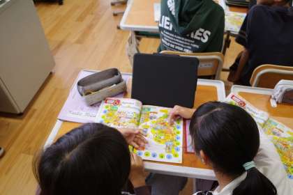 英語の時間です。アルファベットの学習に取り組んでいました。絵の中から、小文字のアルファベットを探す課題に取り組んでいました。自然と友だちと関わりながら学習する姿も素敵だと感じました。