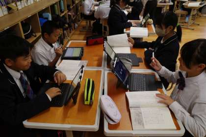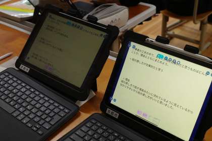 6年生は国語で、“「鳥獣戯画」を読む”という説明文の学習を進めています。こちらのクラスでは、筆者の表現の工夫や良さについて話し合い、タブレットにまとめる課題に取り組んでいました。「たくさん書けたよ!」と嬉しそうに見せてくれる子もいました。