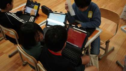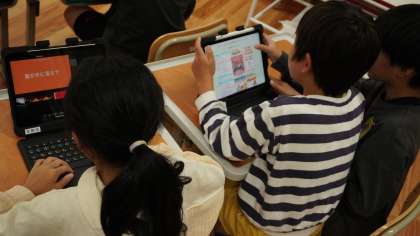 CO2を減らすために何ができるのか。旬の野菜を食べることにどのような利点があるのか、タブレットを活用しながらプレゼンや動画を仕上げています。