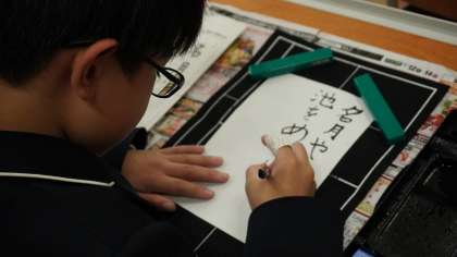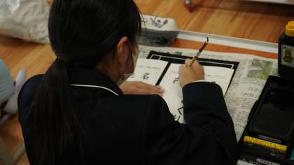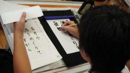 6年生は習字の時間。 細筆の使い方を学習し、お手本を見ながら丁寧に書き進めていました。