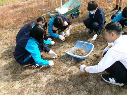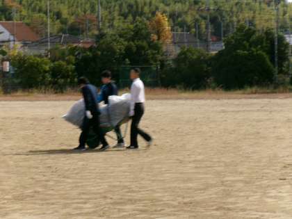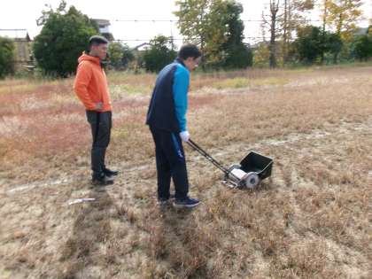 チャレンジ体験-5- 公開日 2025/11/06 更新日 2025/11/06 8年生 事業所が休みの生徒たちは学校で管理用務員さんの作業を手伝っています。 第2グラウンドにはたくさん落ち葉が落ちているので、授業や部活動がしやすいように、落ち葉集めをしてくれています。