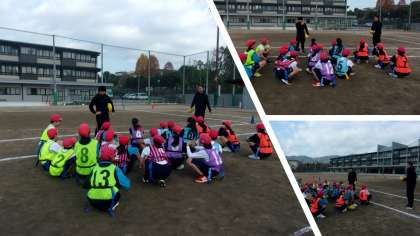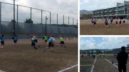 体育の授業でタグラグビーに取り組んでいました。
