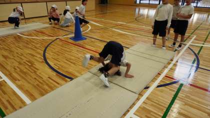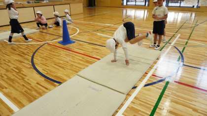 マット運動を行っています。 それぞれめあてに沿った技に挑戦中です。