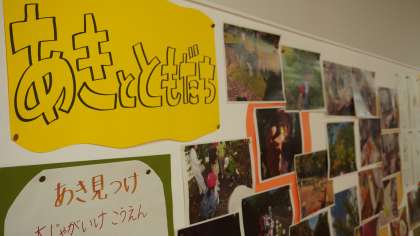 生活科の単元「あきとともだち」で校外に出かけた際の写真が掲示されていました。