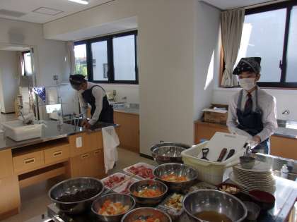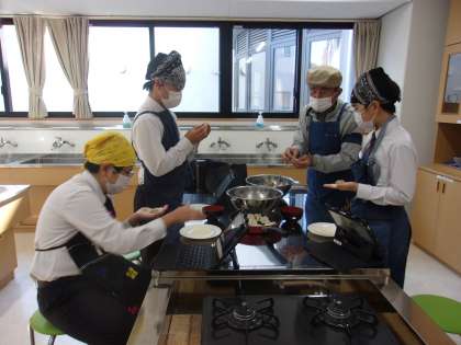 後期課程1組は調理実習です。 餃子を作っています。 最初は難しかったですが、 慣れてくるときれいに包むことができました。