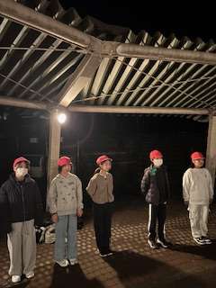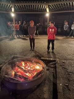 キャンプファイヤー。最後は5年生の思い出の曲、笑顔を消えゆく火を見つめながら歌い上げました。