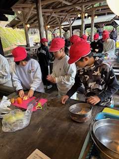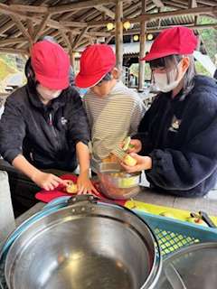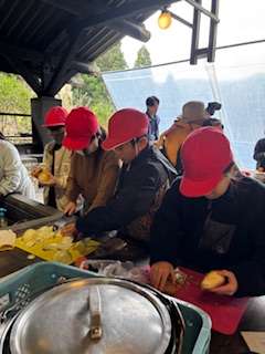 野外炊事。家庭科で学習したことを思い出しながら調理しています。