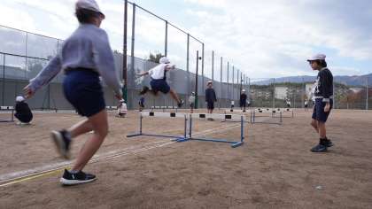 4年生はハードル走を行っています。 ハードルの間をリズムよく走り切れるように練習しましょう。