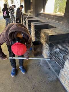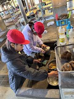 野外炊事。来た時よりも美しく返却できるよう、力を尽くしています。