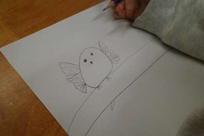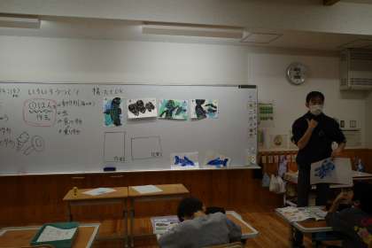 新しく取り組む、「紙版画」についての説明をきいています。