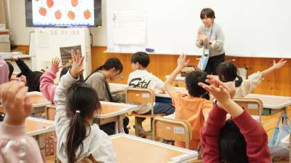 テンポよく指導者のカスタネットの音に続いて元気に発音しています。