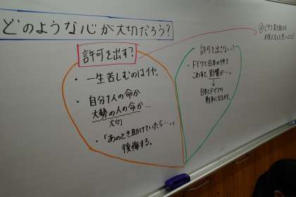 第二次世界大戦時、6000人のユダヤ難民の命を救った日本人「杉原千畝」を題材に、正しいと思うことを信じて行動することの意義や、よりよく生きることについて話し合い、考えを深めることができました。