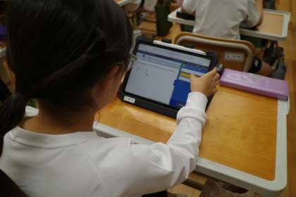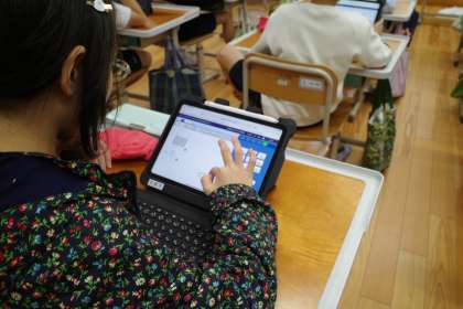 算数の最後の5分、「ミライシード」を使って授業で学習した内容の練習問題に取り組んでいます。