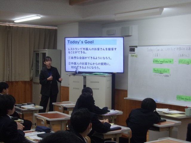 7年生の英語の授業では、「レストランで外国人のお客様を接客する」場面のロールプレイを行いました。