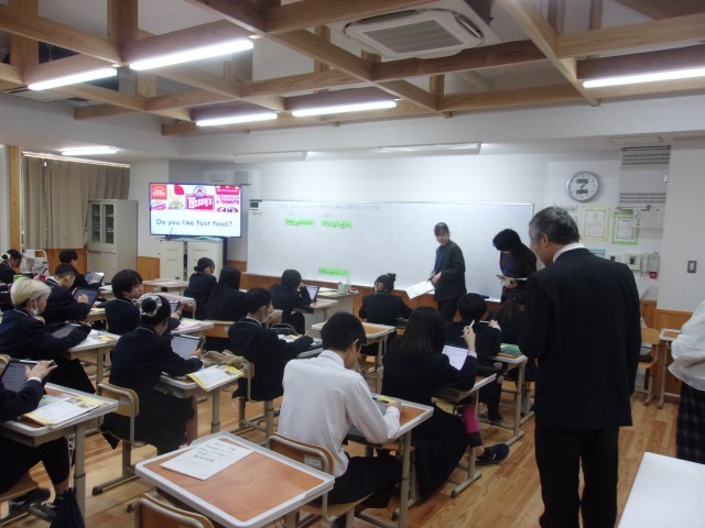 生徒たちは、注文を聞く表現や聞き返しのフレーズを使いながら、店員役と客役で積極的に会話を練習しました。