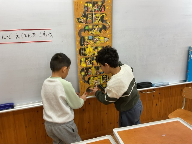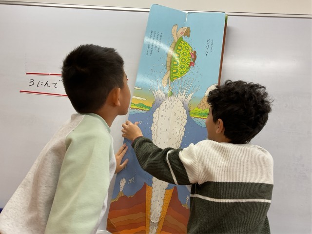国際教室では、2年生が一緒に学びました。図書館で借りたタテ型の大きな絵本「ちか100かいだてのいえ」。
