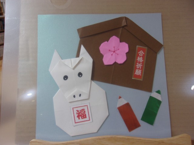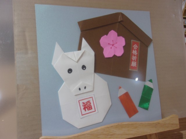 春を思わせる梅の花や、学びを象徴する鉛筆の折り紙など、