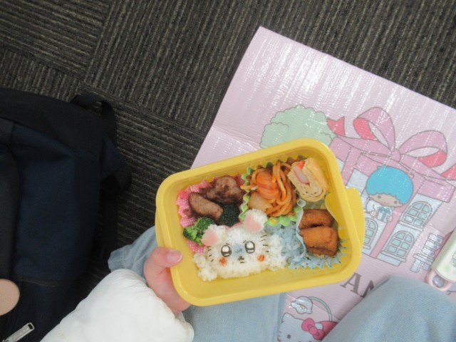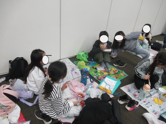 グループで敷物をしいて「いただきまーす!!」「美味しい~!!」