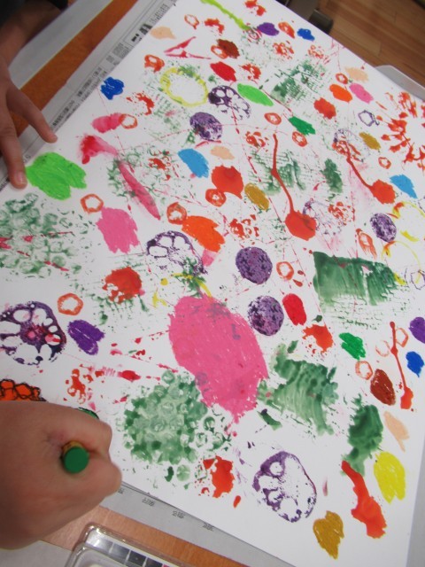 スタンピングしたものをじっくり見て、今日はパスで絵を付け足しました。