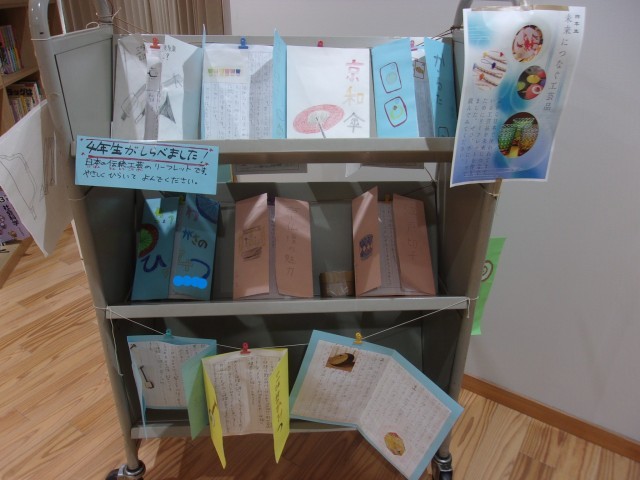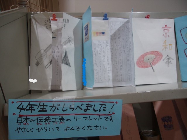4年生が調べて作成してくれた日本の伝統工芸のリーフレットが図書室前に並んでいます。