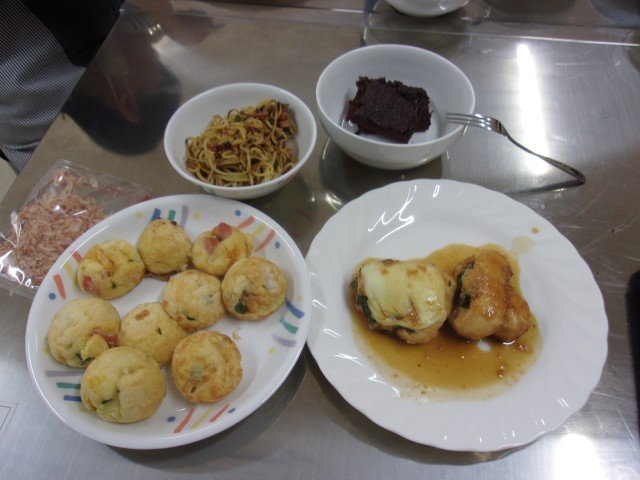 たこ焼き、焼きそば、ささみチーズ巻き、チョコブラウニー