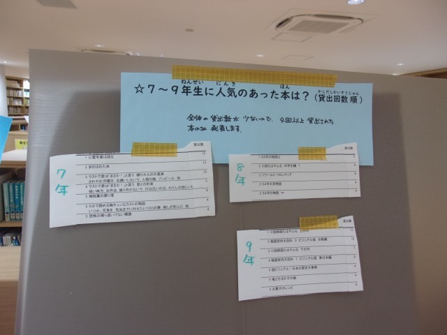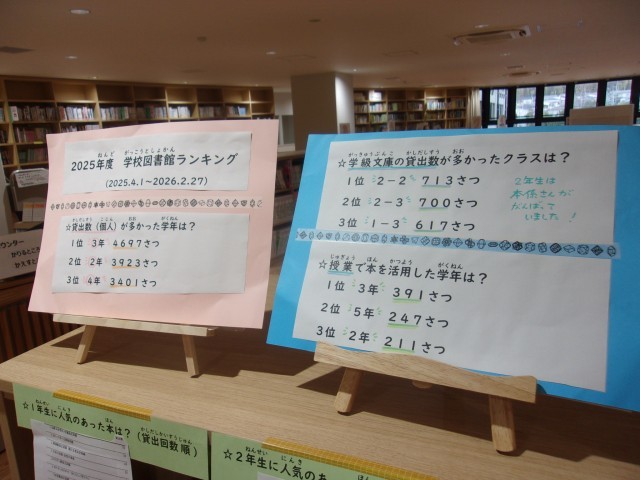 図書室に今年度の貸出ランキングが掲示されています。学年別・クラス別の貸出数や、7~9年で人気だった本の一覧など、1年間の読書の様子がよくわかる内容となっています。来年度もたくさんの本との出会いがありますように。