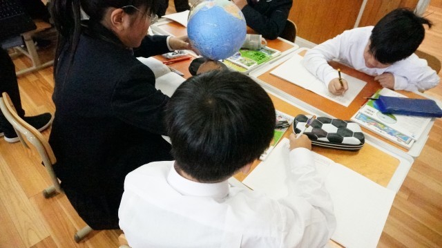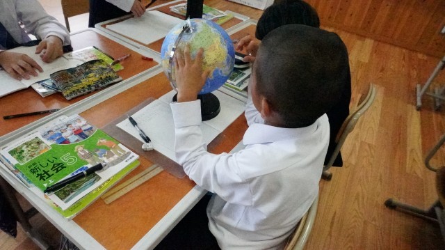日本の国土について学びます。地球の中に日本という国がどのような場所にあるのか地球儀を使って確かめています。