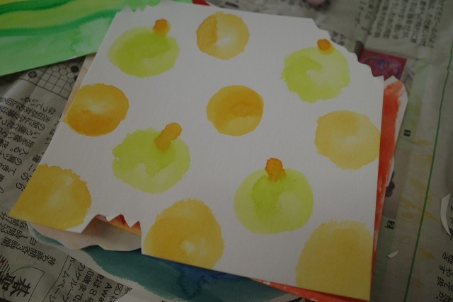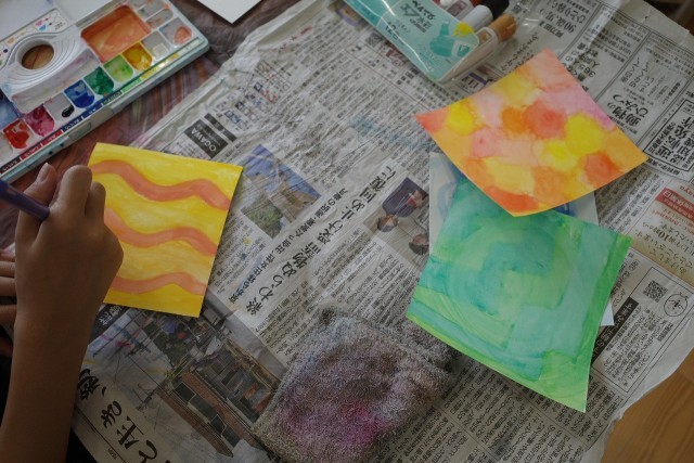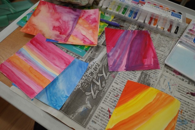 いろいろな表し方でかいたもようの紙。見ているとどんな「気持ち」がうかぶでしょうか?
