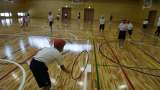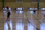 4年2組は体育の学習。 相撲遊びの単元です。武道場で手押し相撲を行っていま...