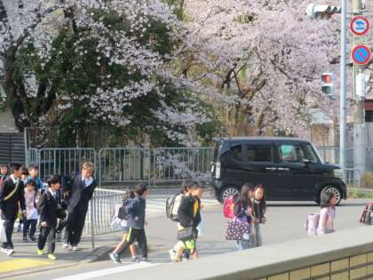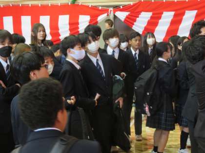 朝の登校時の様子および後期課程(中学生)のクラス発表の様子です。