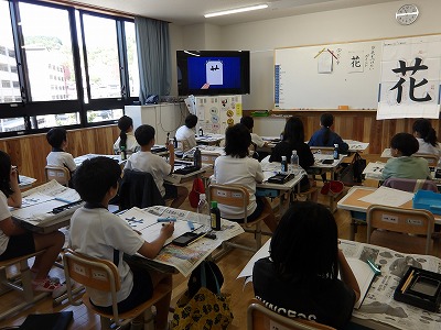 点画の筆使いに気をつけて「花」という字を書きました。どこに気を付けて書くのかを話合い、集中して取り組んでいました。
