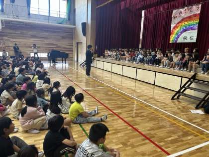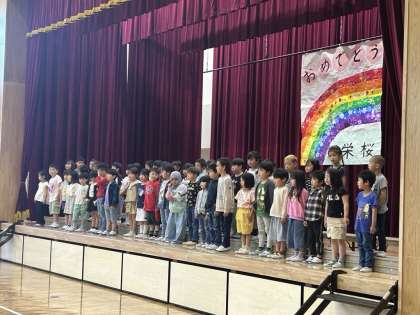 1年生をむかえる会を全校1〜9年生で行いました。司会・運営を務めてくれたのは、ファーストステージリーダーの4年生です。入場は9年生が手をつなぎ、エスコートしてくれました。歓迎の歌や言葉でみんなが盛り上がりました。1年生へのおめでとうの気持ちが伝わりました。
