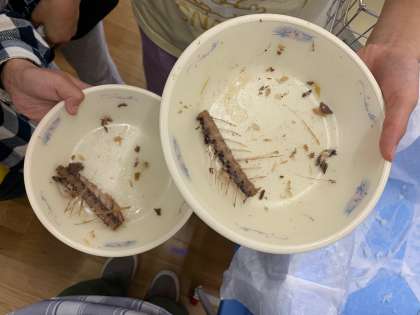 お箸の持ち方とお魚の食べ方の学習をしました。給食で出てきたさばのしょうがにも上手に食べられました。