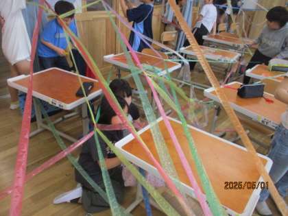 ひもでつないでの学習では、教室を大変身させました。とても楽しく活動していました。